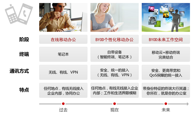 BYOD移动办公集合了安全、网络、协作、终端等多个领域的优势和产品,为客户提供完整的移动办公解决方案,可以帮助政府、企业客户随时随地通过任意智能终端访问多种应用、处理核心业务和提升办公效率,打造创新型政府、高效型企业,与此同时,员工满意度也得到提高。