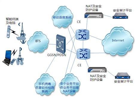 移动互联网安全接入解决方案通过在移动互联网接入侧部署安全网关,通过网络地址转换(NAT)功能帮助移动运营商解决地址资源不足的问题。同时,进行网络攻击防护和用户上网日志审计,保障移动数据业务稳定运营和满足监管要求,具体可实现: